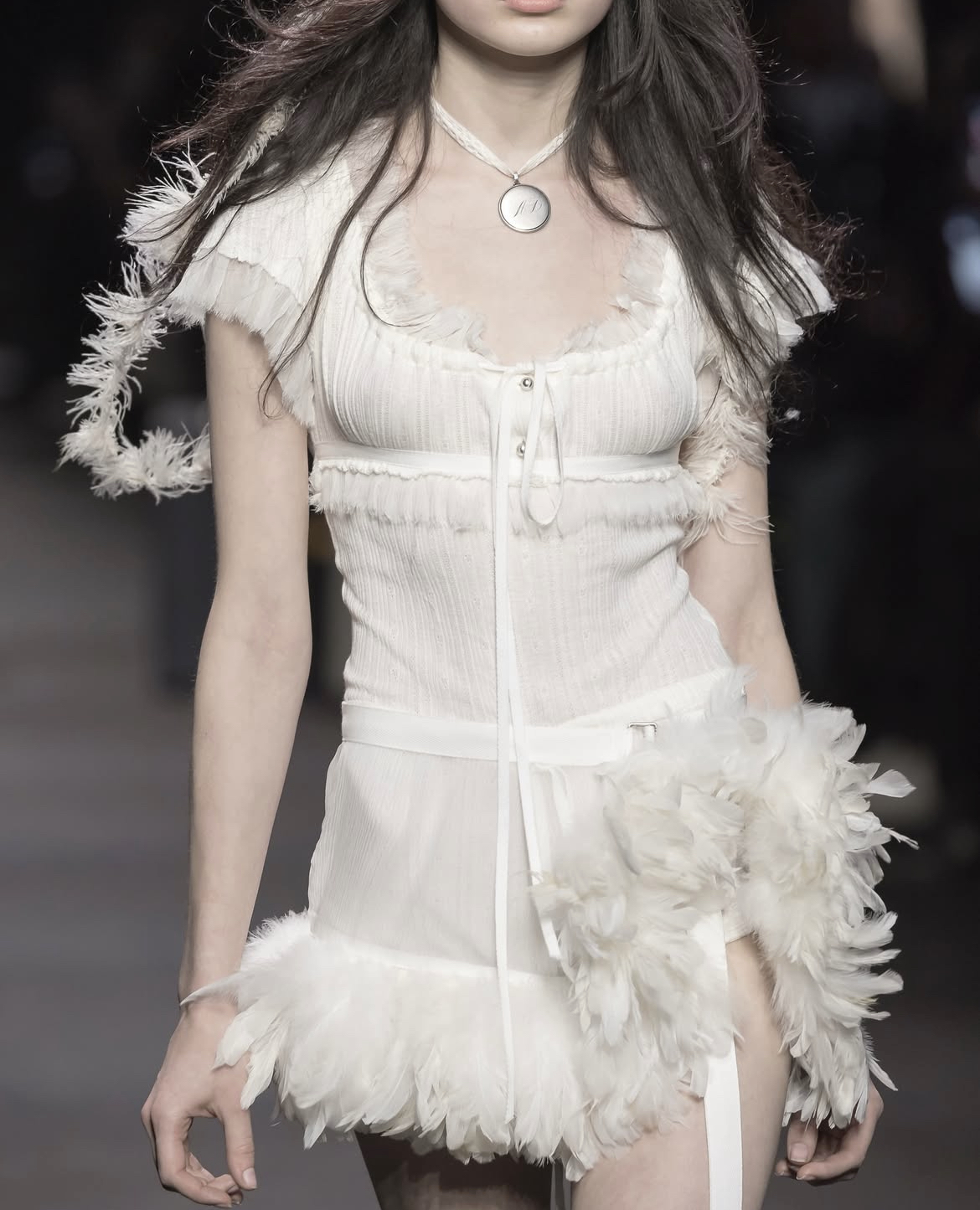 Fjær var vanskelig å ikke legge merke til denne sesongen. Fra The Attico, til Stella McCartney, Ann Demeulemeester og Victoria Beckham, viste merkene fjærkreasjoner tolket på en rekke ulike måter. Hodebånd, kjoler, bodysuits og smykker i fjær er noen eksempler på hva designerne presenterte. Nå er det store spørsmålet: vil vi få en ny epoke av hår-extensions med fjær? (Stella Mccartney debuterte også for SS26 hennes «Fevvers«, som er et vegansk alternativ til fjær.)