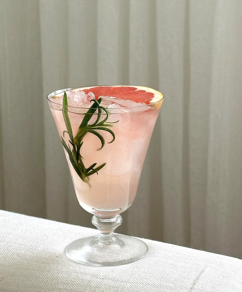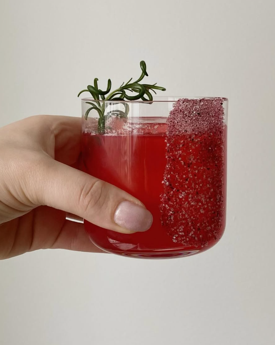 Ha i en stor isbit og sil over drinken. Pynt drinken med en kvist rosmarin. Føler du deg litt ekstra, sleng på en tørket appelsinskive også.