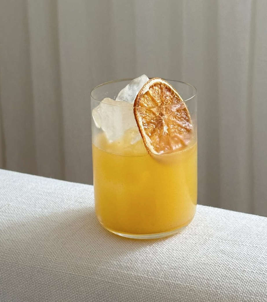 Ha alle ingrediensene pluss is i en shaker. Rist godt. Fyll et glass med is og dobbeltsil drinken. Pynt med en tørket appelsinskive! Skål!