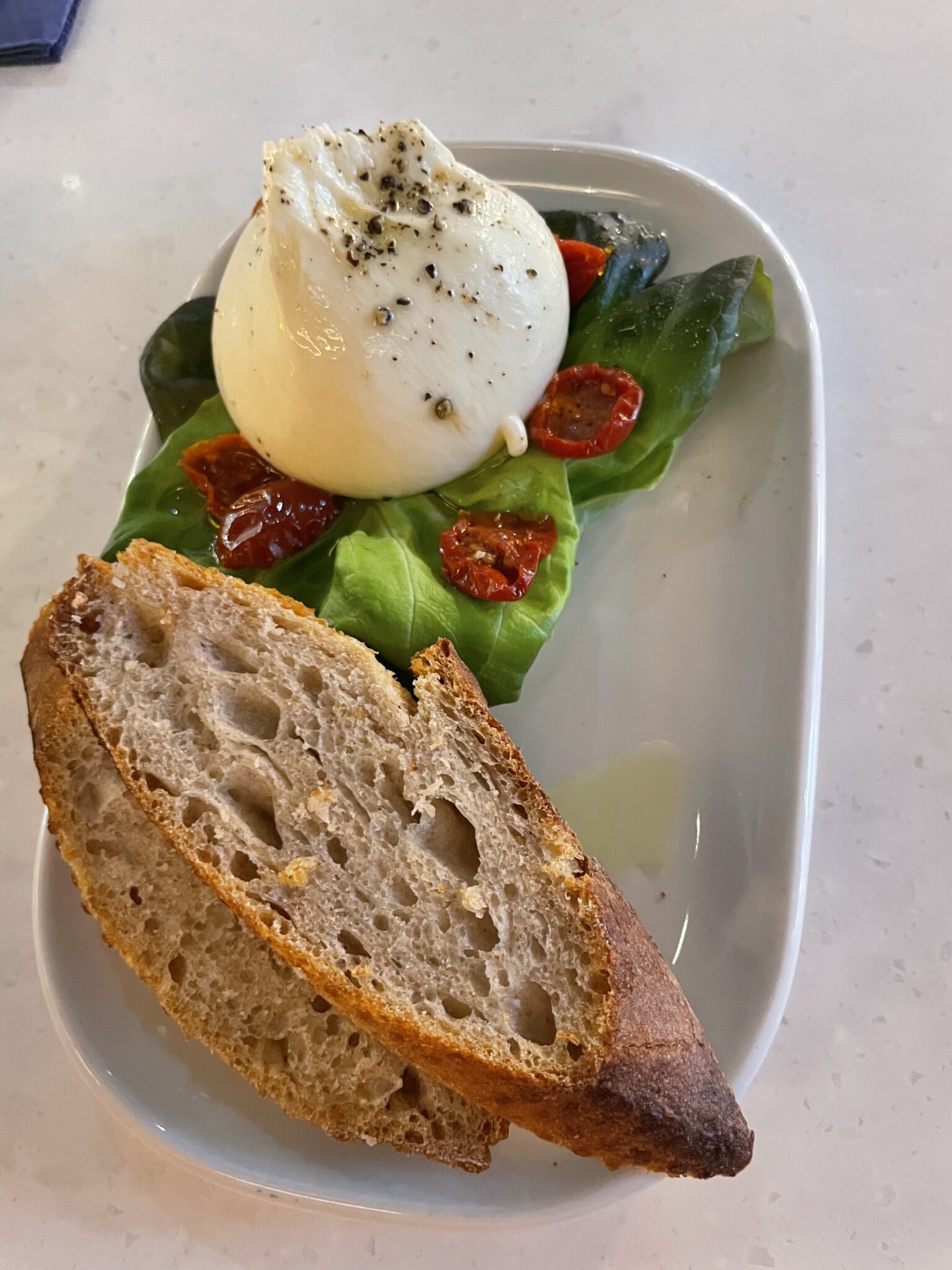 Vi startet med «for osteelskere», en liten forrett bestående av husets Snøball Burrata, confiterte tomater, olivenolje, salt og pepper. Tomatene var et lite høydepunkt i seg selv. Burrataen levde opp til ryktet: kremet, balansert og akkurat så fersk som den skal være.