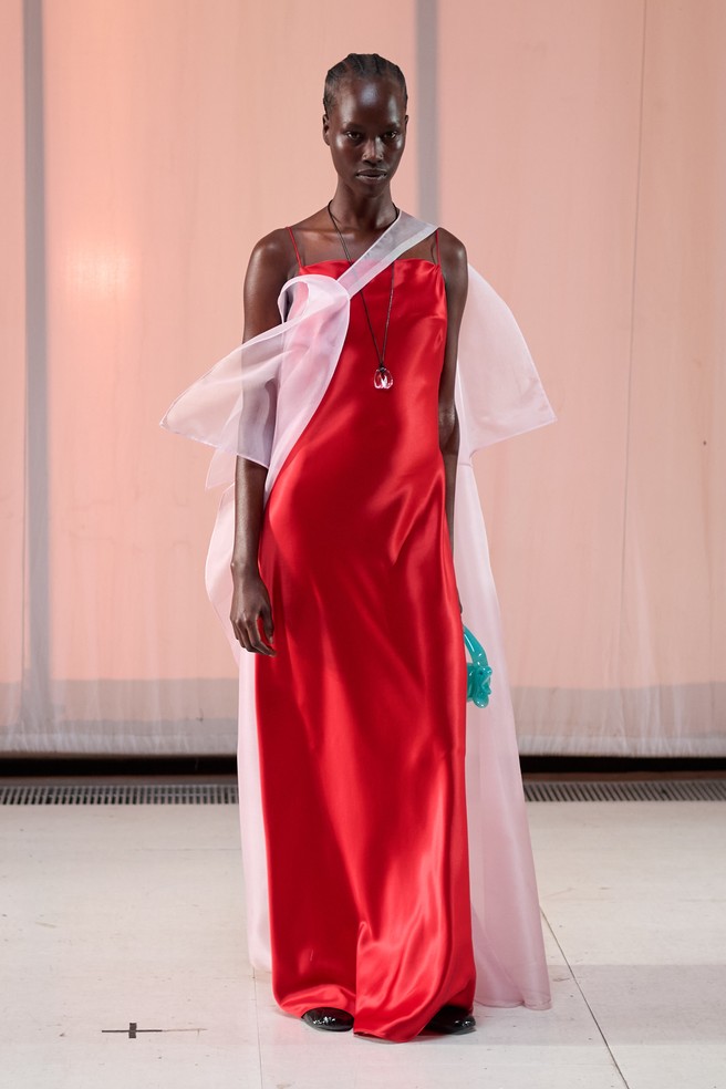 Flere kolleksjoner hentet inspirasjon fra 80-tallet, med brede skuldre, voluminøse skjorter og høyt liv, ofte tolket i pasteller og feminine silhuetter. Caroline Bille Brahe hos Caro Editions tolket power dressing på en mer leken og feminin måte, med oversized sløyfer og court-sko; en moderne variant av 80-tallets stil.