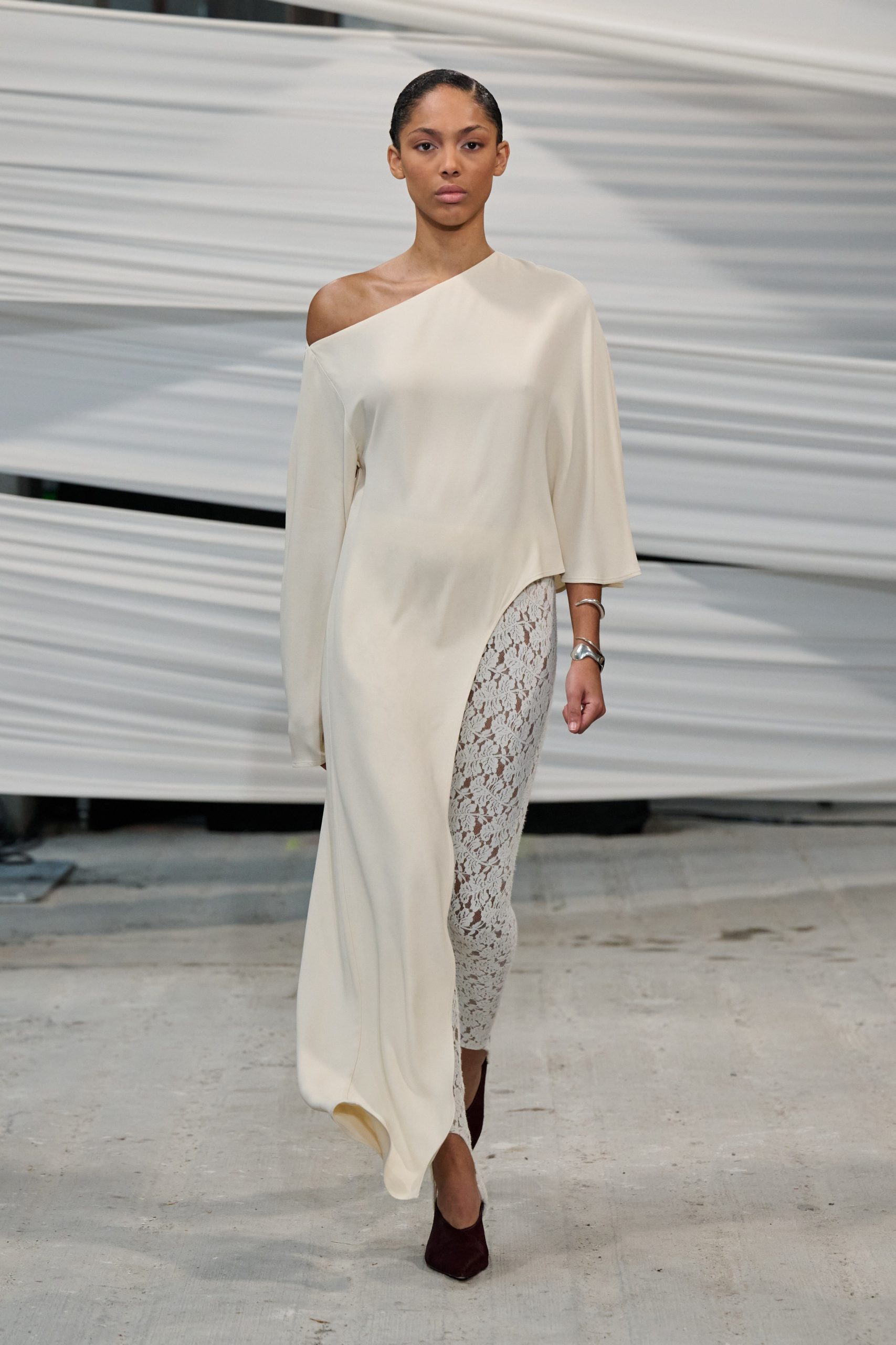 Silhuettene fremstår både kontrollerte og avslappede. Kokongformede ermer og tønneformede bukser gir volum uten tyngde, mens blazere og skjorter er nytolket gjennom forskjøvne snitt og løsere proporsjoner. Lavtsittende silhuetter i skinn og ull peker diskret mot 80-tallets maktestetikk, «power dressing», men uten å bli nostalgiske; en referanse som føles mer som et ekko enn et sitat.