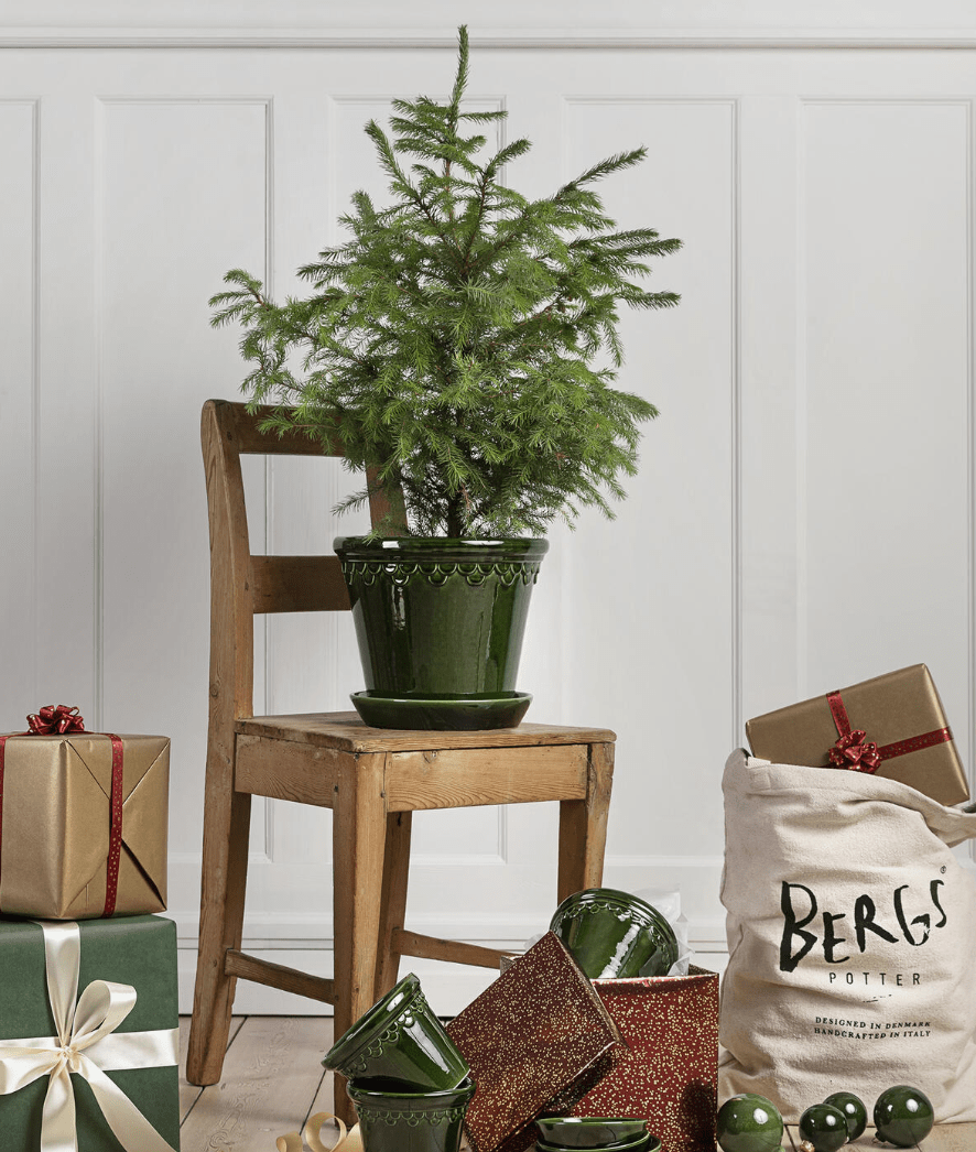 For å skape en jordnær, moderne jul bruker vi naturmaterialer gjennom hele hjemmet. Tørkede kvister, kongler, granbar, kornaks og små bunter med tørkede blomster gir en vakker kontrast til skinnende metall og glass. Vi lar også de grønne plantene spille en større rolle, gjerne i kombinasjon med elegante potter fra merker som Bergs Potter.