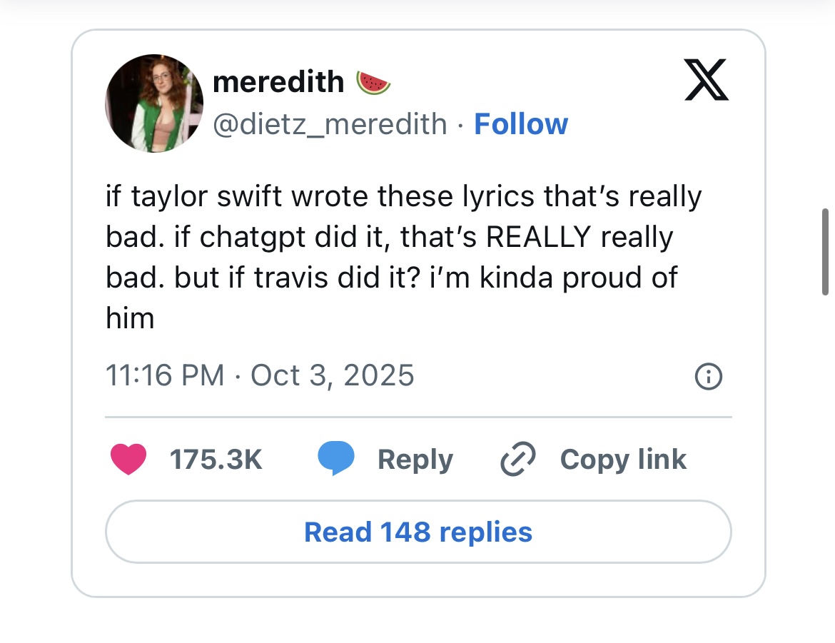 Swift selv har kommentert kritikken med et glimt i øyet. Hun sier at all oppmerksomhet, positiv eller negativ, er verdifull. Hun har også fortalt at hun bevisst unngår å lese for mye av det som skrives om henne på sosiale medier, og at hun har slettet flere apper fra telefonen for å slippe det hun beskriver som «doomscrolling».