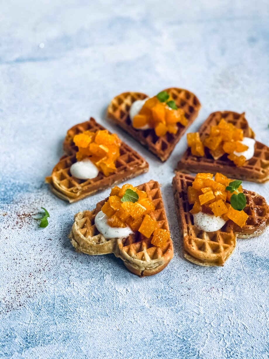 Her er en oppskrift på sprø kardemommevafler med brunostkrem og appelsin: en liten twist på den norske klassikeren.